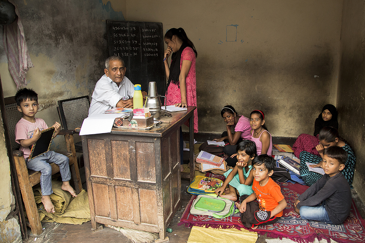 L’école de rue Au bord d’un trottoir des enfants prennent des cours de mathématiques donnés par un retraité dans… L’école de rue